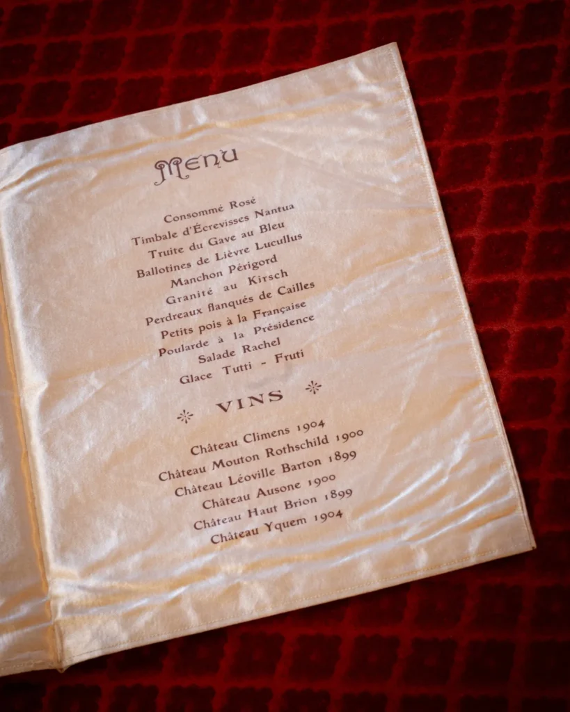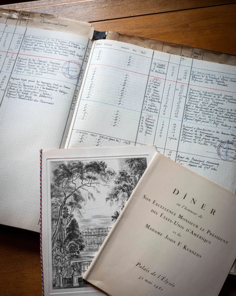 藏品中的大部分菜单,见证了曾选用侯伯王酒庄葡萄酒的众多尊贵午宴与晚宴,记录了美食与佳酿在诸多重要场合的和谐交融。在这些珍贵文献中,尤为值得一提的是四册手写记录簿,详细记载了法王路易十四与路易十五在凡尔赛宫的宴饮菜单。此外,一份1903年5月2日的丝绸材质晚宴菜单也堪称馆藏瑰宝——在《英法协约》筹备期间,法国总统埃米尔·卢贝(Émile Loubet)为款待到访的英国国王爱德华七世举行了这场宴会。最后,戴高乐将军首个总统任期(1959至1965年)内的两册爱丽舍宫酒窖记录簿原本,更为这部围绕权力核心演绎的待客艺术史,增添了浓墨重彩的一笔。